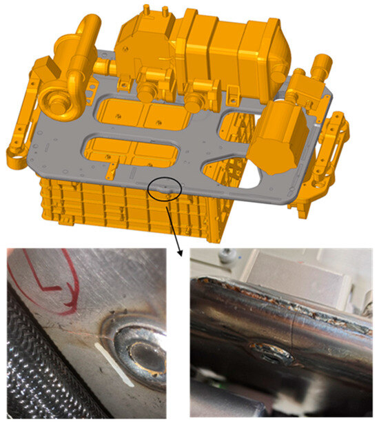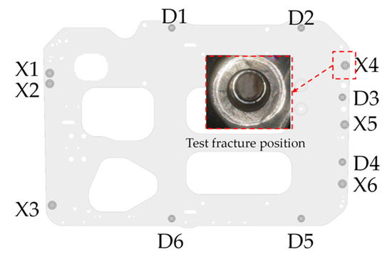 Random vibration testing, conducted in accordance with national standards, revealed that the fixed plate assembly of the fuel cell system remained intact under random and fixed-frequency vibrations in the X and Y directions. However, under random and fixed-frequency vibrations in the Z direction, cracks developed at the D6 position of the B plate, consistent with the damage predicted by fatigue simulations. The locations of the fatigue cracks are shown in Figure 26 and Figure 27.