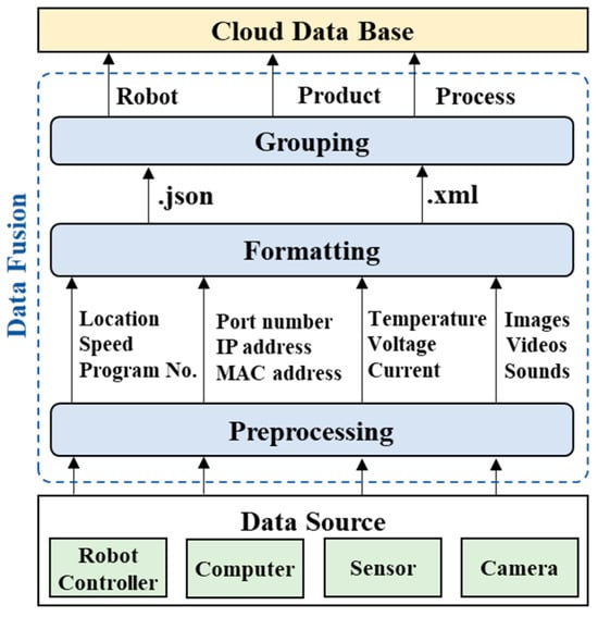 Data pre-processing is an early stage of data fusion. It refers to cleaning tasks, such as noise removal, error correction, and normalization, which adjust data to a specific range or format. Data formatting is a common standard for all data. This includes data type conversion, date format standardization, and categorical data alignment. At this stage, the metadata are stored in JSON or XML format. Data grouping is the process of organizing data into meaningful categories or clusters and is based on specific attributes, such as time, location, sensor type, and data source. This step is used for future analysis or prediction by processing and managing the data within a logically divided group. Finally, the processed data are stored in a cloud database and later used to derive information.