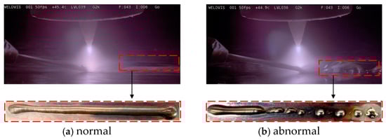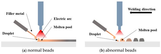 As shown in Figure 4, the normal beads are characterized by a consistent width and height and a uniform surface texture. In contrast, abnormal beads exhibit irregular shapes, abnormal size changes, irregularities, and surface defects. These defects may be caused by factors such as thermal instability, welding conditions, and imbalances in material supply. Several image-based methods have focused on real-time monitoring and quality management of WAAM processes. For instance, recently, Cho et al. [36] improved the efficiency of the process and the quality of the final product by evaluating the quality of each bead in real time using a high-resolution camera and a CNN-based image-processing algorithm.