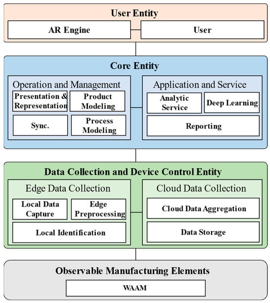 The major differences from ISO 23247 are as follows. First, the role of the DCDCE is expanded, moving away from a centralized approach to distributed data processing and decision-making across the network. This minimizes bandwidth requirements and enhances data management efficiency. Second, the CSE is replaced by two new sub-entities in the DCDCE: edge and cloud data collection. This reduces the architecture’s complexity, improves manageability, and simplifies operations in scenarios requiring rapid data processing and decision-making. Additionally, this change enables the protection of sensitive information within a more controlled range by processing data locally at the edge, instead of using a centralized model. Third, the functional entities (FEs) were modified and discussed in detail.