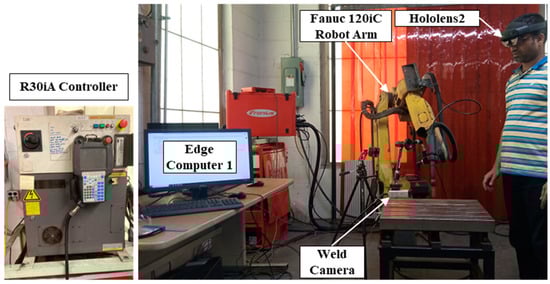 The E-DT architecture for quality monitoring in WAAM is shown in Figure 5. It comprises four layers: OME, DCDCE, CE, and UE. Each of these entities is explained in detail below. Figure 6 shows the OMEs for this case study. A Fanuc 120ic robotic arm performs the WAAM, a Fanuc R-30iA controller controls the robot’s behavior, and a Miller Dynamic 400 GTA provides the power required for the WAAM. Molybdenum, argon, and SS613L were used as the feed, shielding gas, and base material, respectively. Weld cameras were used to collect video data on the beads formed during the process, and the robot movement and operator location were checked through a webcam.