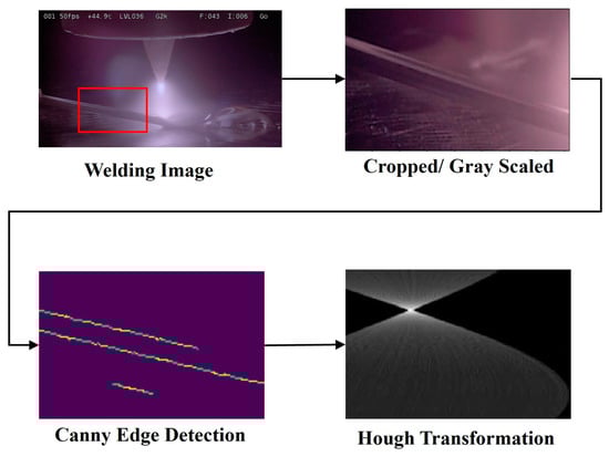 The product-modeling FE models the robot using computer-aided design (CAD), and the process-modeling FE models the logical structure of the process in C# code. The analytical service FE analyzes the collected data and provides relevant information, as shown in Figure 7. The images captured by the weld camera are divided into frames. The fixed area is then cropped (red box in Figure 7). Subsequently, the cropped image is processed in black and white, and the edges are extracted using the Canny edge-detection algorithm. After extracting the line, the number, angle, and thickness of the line segments they are extracted via Hough transformation. As a result, the analytic service FE extracts the rod wire slope, arc size, and bead width through the frame extracted from the video. The deep-learning FE performs predictive analyses, complex pattern recognition, and advanced decision-making processes. Cho et al. [36] demonstrated that MobileNetV2 exhibited the highest performance in detecting abnormal bead images. Accordingly, in this FE, MobileNetV2 is trained using Pytorch and the current process state and arc shape are predicted. The reporting FE collects information derived from the analytical service and deep-learning FEs. The presentation and representation FE shows WAAM information derived from the analytical service and deep-learning FEs to users through a user interface (UI), as shown in Figure 8.