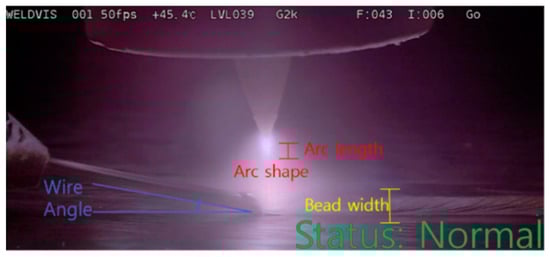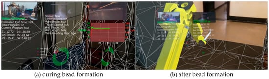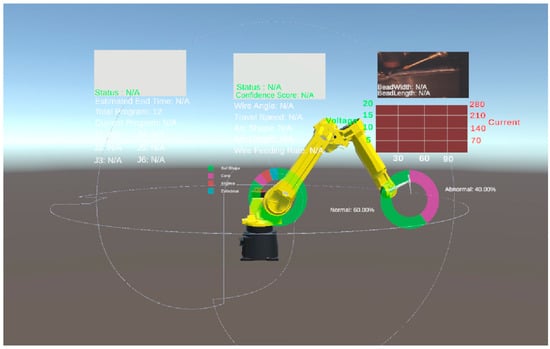 Figure 11a shows a snapshot of the UI showing the bead formation process in an AR environment. This demonstrates the robot monitoring state. It displays the product manufacturing process and the current quality state, which is classified as ‘Normal’ or ‘Abnormal’. Additionally, information for checking process parameters, such as the arc shape and wire speed, can also be observed. Immediately after completing one bead, its entire appearance is checked, as shown in Figure 11b. The voltage and current values when creating the beads are also shown in the graph. The arc distribution, abnormal bead ratio, and movie clip of the process are also available at the end of the process.