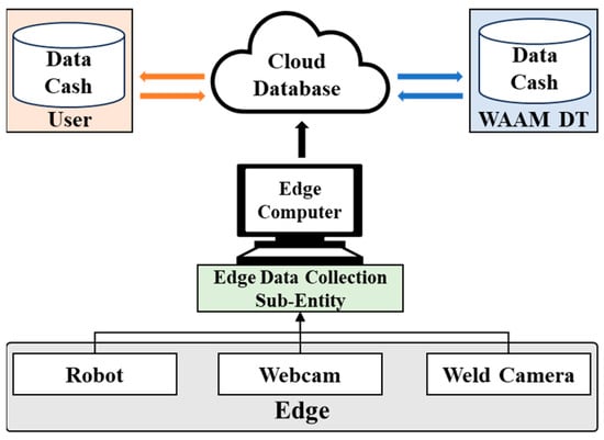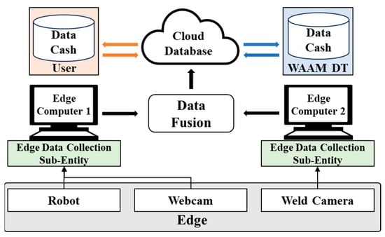 Notably, there is one edge computer here, whereas two edge computers exist in the proposed E-DT. In the information flow based on ISO 23247, one edge computer receives all data from the robot, weld camera, and webcam. Additionally, the received data are transferred to the cloud without data fusion. Furthermore, the DCDCE edge and cloud data collection sub-entities in the proposed framework are omitted. Instead, a data collection sub-entity was implemented.