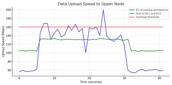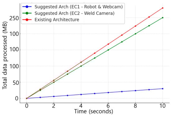 Also, the proposed edge computing-based architecture reduces network load compared to existing architectures, as illustrated by Figure 14, which often exceed network overload thresholds in data-intensive environments. By leveraging the data fusion module for preprocessing at each edge computer, the system effectively categorizes and compresses raw data locally before transmission, leading to a smaller overall data output. This approach not only minimizes bandwidth requirements but also stabilizes computational fluctuations, as each edge device processes only relevant, pre-filtered data. The resulting streamlined data flow prevents bottlenecks and ensures consistent, real-time data handling across the network, contributing to more stable and efficient digital twin operation in high-volume manufacturing environments.