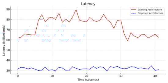 Furthermore, the proposed architecture achieves a reduction in latency for digital twin operations, as illustrated by Figure 15, primarily due to the smaller data upload volume and consistent upload speed. By preprocessing and categorizing data at each edge computer through the data fusion module, the system minimizes the amount of data that must be transmitted to the central network. This reduction in data volume, combined with a stabilized upload process, significantly decreases the time required for data to travel from the physical environment to the digital twin. Consequently, the digital twin can more effectively maintain real-time synchronization with the manufacturing process, enhancing the responsiveness and accuracy of decision-making in data-intensive scenarios.