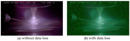 The effect of the unprocessed data can be seen in Figure 16 which shows video frames captured by the weld camera. The frame with data loss accounted for only 30% of the capacity of the original frame, indicating a 70% data loss. This loss can be seen in Figure 16a. This limits the ability to divide and store the images captured by the weld camera in real time.