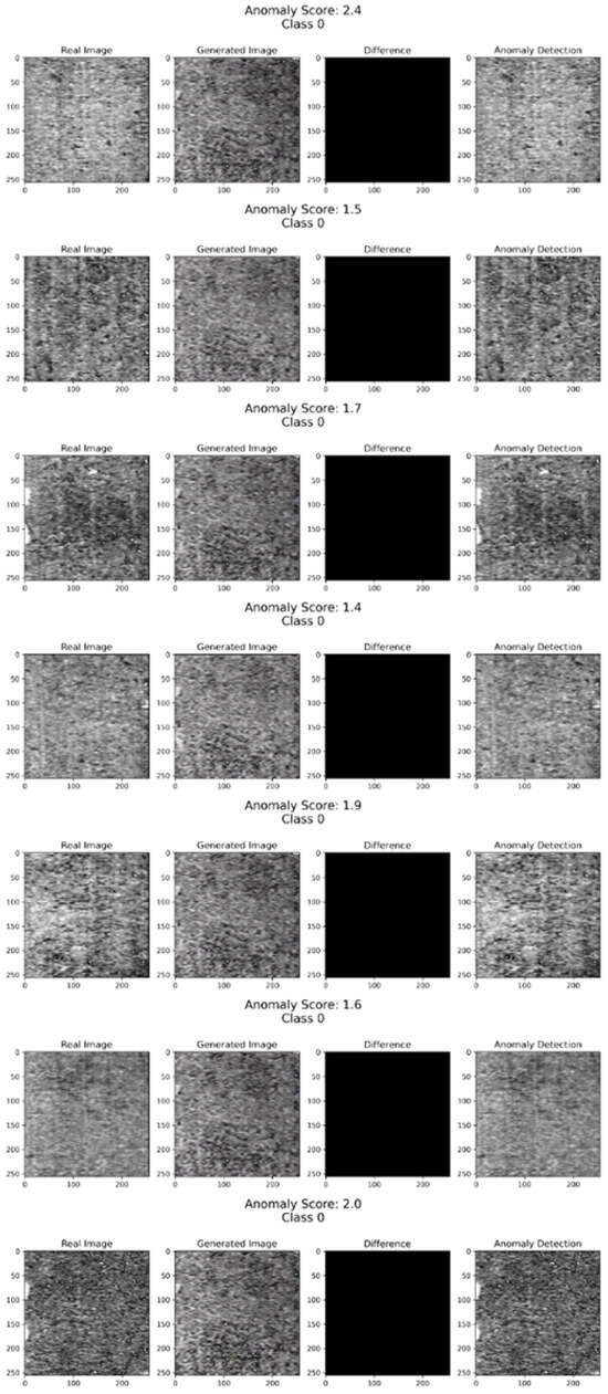 Figure 4 is the result of anomaly detection for normal images in the Kolektor surface-defect dataset. FS-GAN’s anomaly detection is performed by comparing the first image (the actual image data) and the second image (the generated image) to obtain a difference map. However, when looking at the third image, which is the difference map of the corresponding images, it is determined that there is no difference, so anomaly detection is not performed. In addition, the model determines that the input image is a normal image, so class 0 is output. The following code is part of the data preprocessing code.