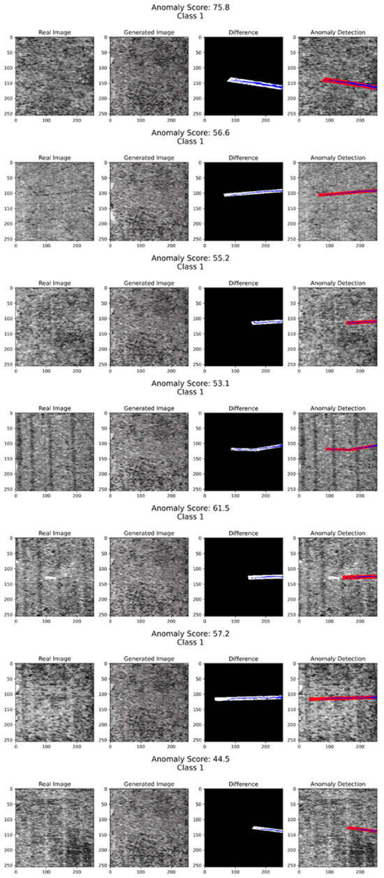 Figure 5 illustrates the anomaly detection process for abnormal images in the Kolektor surface-defect dataset. The first image represents the actual abnormal image, while the second image is the normal image generated by FS-GAN. The third image shows the difference map, highlighting regions where discrepancies exist between the actual and generated images. Finally, the fourth image visualizes the anomaly detection result, with the detected defect areas clearly highlighted in red. This visualization demonstrates FS-GAN’s ability to accurately identify anomalies, even for small and subtle defects. The difference map and the corresponding highlighted regions validate the model’s capability to distinguish between normal and abnormal regions effectively, which is particularly critical in industrial applications where small but important defects must be detected. Moreover, the model classified the input image as abnormal, outputting class 1, consistent with the actual label of the abnormal image. This highlights FS-GAN’s exceptional anomaly detection capability, even when trained with limited data. By successfully detecting anomalies in a limited-data environment, FS-GAN shows comparable or superior performance to other models that rely on larger datasets.