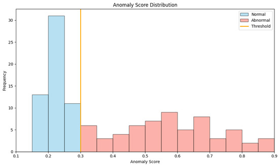 Figure 6 visualizes the distribution of anomaly scores generated by FS-GAN for the Kolektor surface-defect dataset. The x-axis represents anomaly scores (ranging from 0 to 1), while the y-axis indicates the frequency of images at each score. The model uses a threshold of 0.3 to classify images: scores below 0.3 are considered normal, while scores above 0.3 are classified as abnormal. The graph clearly shows a distinct separation between normal and abnormal data. Normal images are clustered below the 0.3 threshold, with most scores concentrated between 0.2 and 0.25. This indicates that, although the generated image and the actual normal data do not perfectly match, the differences are minor, and the discriminator consistently classifies them as normal. Conversely, all abnormal images score above 0.3, with scores distributed across a wider range, reflecting the varying severity of defects. The abnormality score is calculated as the sum of the residual loss and discriminator loss, and this score effectively separates normal and abnormal data without error. The varying distribution of abnormal scores indicates that FS-GAN is capable of capturing diverse defect characteristics, including small cracks or subtle anomalies that are critical in industrial applications. This result confirms that FS-GAN can accurately classify data based on anomaly scores, even in noisy and diverse datasets. By effectively distinguishing normal and abnormal images at a threshold of 0.3, FS-GAN demonstrates its robustness in detecting small but significant defects, which is crucial for practical anomaly detection tasks.