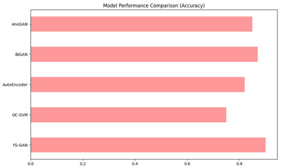 Figure 7 shows the result of comparing models based on accuracy score, which is one of the most important criteria for performance evaluation in machine learning. The accuracy score is an indicator of how accurately a model predicts, with a higher score indicating that the model predicts more accurately. An OC-SVM achieved poor performance with an accuracy score of less than 0.8, and the existing model, AnoGAN, achieved good performance with a score of 0.85, but the model of this paper utilizing AnoGAN demonstrated excellent accuracy with an accuracy score of 0.90 even with few-shot learning.