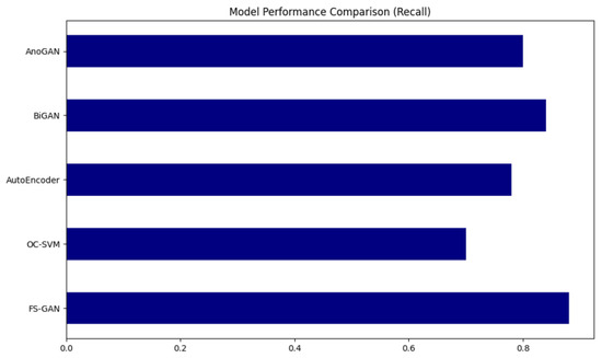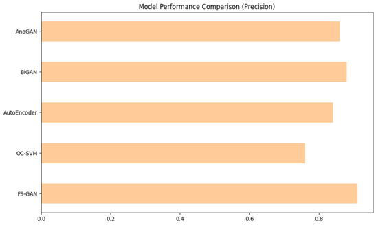 Figure 8 compares the performance of models using the precision score, which evaluates how much the part that is judged to be correct overlaps with reality. FS-GAN is the only model with a precision score value exceeding 0.9, indicating that it has a superior classification ability and is more effective than other models in anomaly detection, where the detection range and error are important.