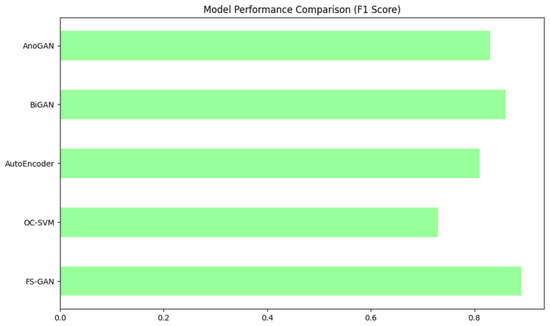 Figure 10 compares the F1 score of each model. F1 scores offer an index to evaluate the performance of a model based on the previously evaluated accuracy and recall. The OV-SVM and AutoEncoder do not exceed 0.8, indicating poor performance. BiGAN and AnoGAN show F1 scores exceeding 0.8, indicating that they are excellent for anomaly detection. However, their performance is lower than that of FS-GAN, which has the highest F1 score due to its high accuracy and recall.
