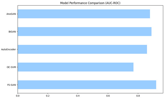 Figure 11 compares models using the AUC-ROC metric, which is an indicator of model performance according to a reference value. A higher AUC-ROC indicates a better model in anomaly detection. The OC-SVM does not achieve a good score in AUC-ROC, which shows that it is not effective at anomaly detection according to various reference values, and BiGAN shows excellent performance with an AUC-ROC score close to 0.9. FS-GAN is the only model with an AUC-ROC value exceeding 0.9, showing that it can achieve the best performance.