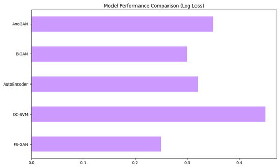 Figure 12 compares the log loss between each model. Log loss, which is a value that develops a sign by taking the log of the probability of predicting the actual value, shows the model’s own incorrect classification as a numerical loss value; the lower the loss, the higher the probability that the model will predict the actual value. AnoGAN produces a value of 0.35 in log loss, which can be seen as slightly lower in predictive performance, and FS-GAN, which is an advanced model, has the lowest log loss value of 0.25 among all models, indicating that it has excellent model prediction performance. In this paper, we propose FS-GAN, an anomaly detection model based on few-shot learning, and show that it can achieve high anomaly detection performance even in a small learning data environment. The proposed FS-GAN model achieved superior performance in various evaluation indices, such as accuracy, precision, recall, F1 score, and AUC-ROC when compared with the existing AnoGAN, BiGAN, AutoEncoder, and OC-SVM on the Kolektor surface-defect dataset. In particular, FS-GAN scored high in precision, recall, and AUC-ROC, indicating that it can effectively detect real defects. During the learning process, the generator and discriminator that learned normal images calculated anomaly scores for abnormal images during the inference process, thereby improving the detection performance of the model. In summary, the results suggest that FS-GAN can provide efficient anomaly detection compared with existing models even with a small amount of data through few-shot learning, and can contribute to the field of anomaly detection with a small amount of abnormal data.
