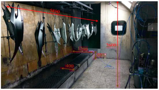 Finally, the actual thickness of the spray applied to the motorcycle shell, sprayed by the 7-axis suspended robotic arm (as shown in Figure 16), must meet the manufacturer’s requirement of 35–40 µm. To verify compliance with this specification, a thickness testing machine was used to measure the film thickness at four different positions on the motorcycle shell.