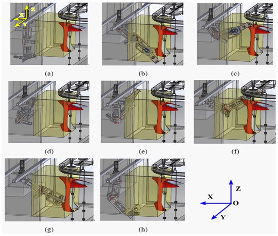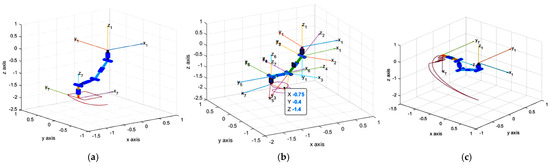 In these simulations, the coordinates of point O are defined as the origin [0, 0, 0], and the coordinates of points a through h, representing various positions achieved by the robotic arm’s movements, are calculated relative to this origin. These coordinates are systematically outlined in Table 2 to facilitate precise tracking and analysis of the robotic arm’s reach and movement range.