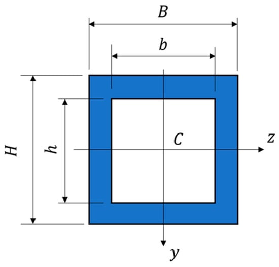 According to the literature [40], the properties of the square tube material and its section such as yield strength, allowable bending stress, allowable shear stress, and dimensions for carbon steel are provided. Using the cross-sectional view shown in Figure 3 and applying Equation (2), the section modulus (S’) of the square tube is calculated. This calculated section modulus must exceed the value obtained from Equation (1), which defines the required section modulus for ensuring structural integrity under load. Based on the data presented in Table 3 and using the same calculation method, the appropriate section modulus for each axis of the robotic arm is determined. This ensures that the selected square tube can adequately support the stresses and forces imposed on the robotic arm during operation, while maintaining stability and safety.