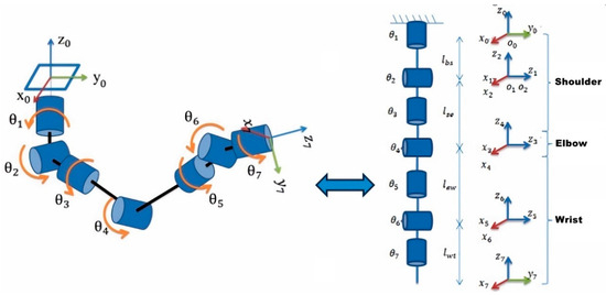 Orientation schematic for inverse kinematics analysis of the 7-axis robotic arm [43].