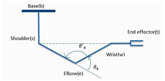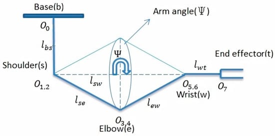 The suspended 7-axis robotic arm is parameterized by defining the arm angle as the angle between the reference plane and the arm plane. The arm plane is defined as the plane passing through the shoulder, elbow, and wrist joints. The reference plane is established by setting the angle of joint 3 to zero, which aligns the axes of rotation for joints 2 and 4 to be parallel. In this non-redundant configuration, the plane formed by the shoulder, elbow, and wrist serves as the reference plane. The coordinates of the wrist point w are calculated as shown in Equation (18).