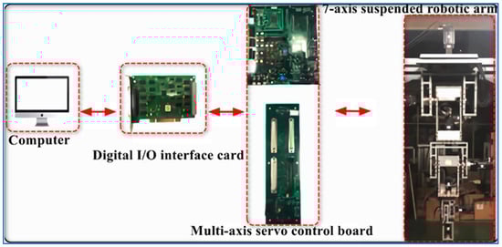 The completed customized 7-axis suspended robotic arm setup includes a computer, a digital I/O interface card, a multi-axis servo control board with an embedded manifold deformation controller, and the controlled body. Each rotating axis utilizes Mitsubishi MR-J4 series AC servo motors, paired with reducers to enhance output torque. The position signals from the motors are processed using pulse incremental encoders associated with the AC servo motors. The computer system is utilized to calculate the necessary control commands, which are then processed and transmitted by the control board developed in the laboratory. This control board communicates directly with the driver to execute the commands and regulate the robotic arm’s movements. The system architecture diagram of the entire setup is presented in Figure 7, providing a detailed overview of how each component interacts within the control system. The diagram illustrates the flow of information from the computer through the control board to the driver, ensuring accurate and synchronized operation of the robotic arm.