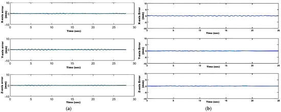 Position error in X, Y, and Z axes during simulation control: (a) rectangular path, (b) motorcycle shell path.
