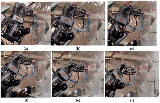 Continuous motion of the robotic arm along the motorcycle shell trajectory from (a–f).