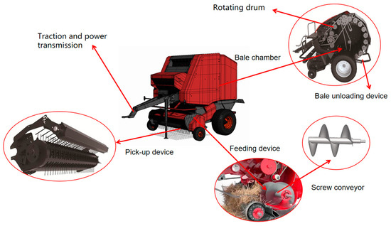 The overall structure of the round baler mainly completes the operations of picking, feeding, bundling, and bale unloading [16,17]. The main components of the round baler are the transmission system, pick-up, feeding mechanism, bale chamber, and bale unloading device [18,19]. Figure 2 illustrates the overall structure. When fieldwork is carried out, the tractor transmits power to various components through the power system. The pick-up device collects straw that is scattered in the field and feeds it into the bale chamber through the screw conveyor and other feeding components. Due to the presence of the rotating drum, the straw is gradually rotated into a bale. The machine keeps working, winding the straw around the growing bale until the bale unloading device finally unloads it.
