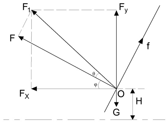 For the sake of analysis, the straw is considered a particle, and one side of the spiral conveyor is considered a slash. According to Figure 3, if the picking mechanism picks up the straw during operation and throws it to point O on the helix surface under the action of the spring-teeth, and the straw’s absolute speed at the point of contact with the helix surface is zero. Therefore, the straw experiences a normal thrust on the spiral surface, along with a tangential upward frictional force . Force produces a deflection force , which decomposes into axial force and radial force under the action of friction force . The straw is transported in the axial direction under the action of the axial force . If the axial force and the friction force acting on the straw are too large and greater than the force of gravity and the friction force generated by the contact between the helix surface and the straw, the straw will rotate with the helix shaft and will not be transported well in the axial direction.