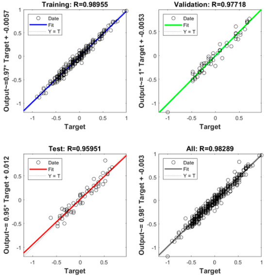 A linear regression fitting relationship exists between the output data of the model and the target data of the training set, as shown in Figure 11. The training set was in a state of basic fit, and the (R) value was 0.989, close to 1, thus indicating a high degree of linear correlation between the two.
