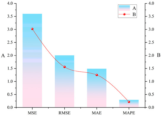 In order to more comprehensively and rigorously evaluate the performance edge of the GA-BP model, an ablation experiment was meticulously devised. In this experiment, the crossover operation was deliberately removed, and solely the mutation operation was preserved to update the individuals within the population. The code was subsequently run, and this same operation was replicated three times to ensure the reliability of the results. During each run, the MSE, RMSE, MAE, and MAPE were precisely recorded. Thereafter, the average values of these performance metrics were calculated for both models. The GA-BP model with the mutation operation intact was designated as Model B, which represents the standard GA-BP model, while the GA-BP model lacking the mutation operation was labeled as Model A. As vividly illustrated in the accompanying Figure 15, it is unmistakably evident that all four performance indicators of Model B are substantially smaller than those of Model A. This conspicuous disparity unequivocally attests to the fact that the standard GA-BP model (Model B) exhibits significantly enhanced performance, thereby further corroborating the superiority of the GA-BP model in practical applications.