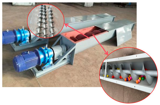 In the actual operation of balers, numerous factors can exert an impact on the baling process. Conducting field tests with the whole machine fails to precisely explore the performance of the spiral conveyor. Consequently, a spiral conveyor was employed to conduct the planned experiment, which enabled the verification of the efficacy of the optimal set of parameters and enhanced the accuracy and reliability of the test data. Colored balls were utilized as substitutes for straws(As shown in Figure 17). The test parameters are presented in the Table 4, and the parameters of the control group correspond to the spiral conveying parameters of mainstream domestic straw balers as listed in Section 5.