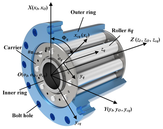 Axis misalignments of the inner ring, outer ring, and rollers are illustrated in Figure 3, Parameters represent the axis error of the q-th roller in the local coordinate system . Parameters and represent the nominal diameters of the inner ring and the q-th roller, respectively.