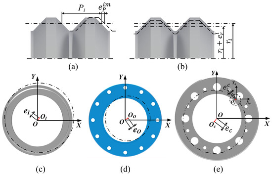 As shown in Figure 2a, represents the pitch error of the m-th thread teeth on the outer ring, the inner ring, and the q-th roller, respectively. It represents the deviation between the actual pitch and the theoretical pitch, mainly caused by the axial feed deviation of the cutting tool. Figure 2b, represents the nominal diameter error of the outer ring, the inner ring, and the q-th roller, respectively. It represents the deviation between the actual nominal diameter and the theoretical nominal diameter, primarily caused by the radial feed deviation of the cutting tool. Lastly, the axial concentricity error of each part is shown in Figure 2c–e. It indicates the deviation between the axis of the thread raceway and the part’s reference axis, mainly caused by the clamping errors during machining. Additionally, it is assumed that all parts have smooth surfaces, meaning that the impact of surface roughness on load distribution is not considered in this paper.