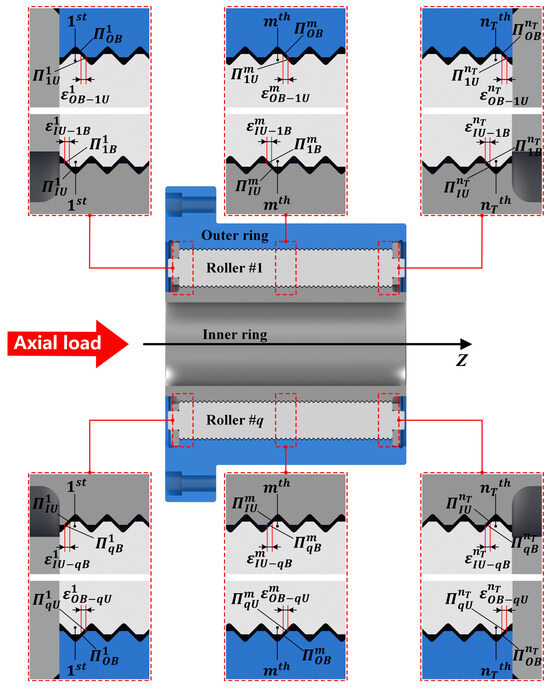 The axial load can be applied on the same side or opposite sides of the bearing. The same-side loading scenario is explored in this study. Figure 4 shows the axial clearance between the threaded surfaces in this scenario. In Figure 4, and denote the upper surface of the threaded teeth of the inner ring and the lower surface of the threaded teeth of the outer ring, respectively. These surfaces are mated with the m-th threaded tooth of each roller, where and is the total number of threaded teeth of a single roller. In addition, the upper and lower surfaces are the higher and lower z-coordinate values of the two sides of the threaded teeth, respectively. Parameters and denote the upper and lower surfaces of the m-th threaded tooth of the q-th roller, respectively. In addition, is the axial clearance between the threaded surfaces and , while is the axial clearance between the threaded surfaces and .