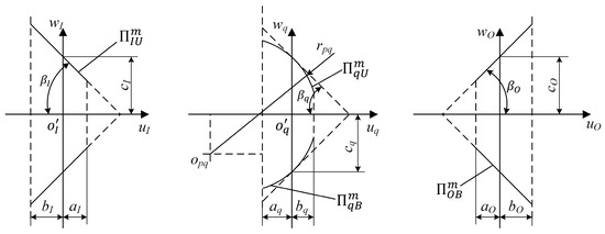 where and represent the surface coordinates of the outer ring, inner ring, and the q-th roller, respectively. Parameters , , and denote the nominal radius, flank angle, and half-tooth thickness of these components, respectively. Parameter refers to the pitch of the threads, while are the coordinates of the center of the circular arc profile of the roller thread, with representing the arc radius.