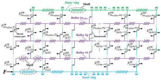 As shown in Figure 6, a multi-roller spring system of the PTRB considering machining error is established. The LDC among the rollers is no longer uniform due to the machining error. The shaft section and the thread tooth contact pair of the PTRB are represented by springs. The thread tooth is simplified as a plate spring, as shown by the vertical line segments. An axial load F is applied to the first node of the inner ring to simulate the force conditions of the PTRB. All nodes are restricted to axial displacement to simulate the boundary conditions. Lastly, the first node of the outer ring is also fixed.