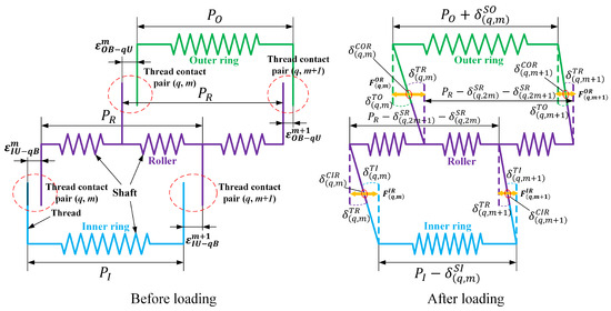 The deformation coordination conditions between two adjacent thread tooth contact pairs on the outer ring-roller and inner ring-roller sides are illustrated in Figure 7. Before loading, all components (except for the outer ring fixed in the housing) are in a free state, with initial axial clearances between the adjacent thread tooth contact pairs. The initial axial clearances among the thread teeth are not identical due to machining errors. Initial axial clearances on the inner ring-roller and outer ring-roller sides gradually diminish once the inner ring is loaded. A closed loop is formed by the two adjacent thread tooth contact pairs. Deformation occurs in the thread tooth contact area to counteract the external load. Even though the deformation varies due to structural dimensions and machining errors of all components, the thread tooth contact loop remains closed regardless of changes in external axial loads. This closed-loop condition ensures contact between the thread teeth. The deformation coordination process means that the deformation of two adjacent thread tooth contact pairs is coupled. Hence, the relationship can be described by the following equations.