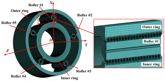 In this section, the accuracy of the proposed calculation model is verified through comparison with static finite element analysis and other published investigations. Table 1 lists the main structural parameters of the geometric model used in the finite element analysis (FEA). The PTRB geometric model is simplified to improve FEA’s convergence and computational efficiency. The number of rollers is simplified to five, the outer ring flange is removed, and the overall structure is treated as a hollow cylinder.