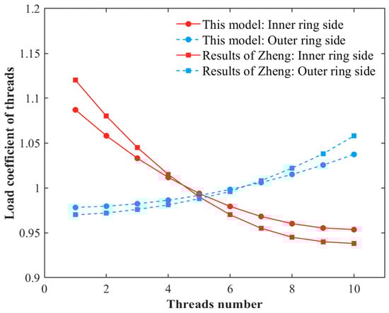 Furthermore, the proposed calculation model is compared with models from the literature. The literature does not consider machining errors and only calculates thread LDC under ideal conditions. Therefore, the thread LDC of the PTRB without errors is compared under the same structural and working conditions from the literature, as shown in Figure 11. The results indicate good agreement between the two models without machining errors. On the inner ring side, the maximum relative error of the load coefficient of threads in this paper compared to the reference [20] is 2.94%, and the root mean square error is 0.0515. On the outer ring side, the maximum relative error is 3.41%, and the root mean square error is 0.0531. This observation further validates the accuracy of the proposed model.