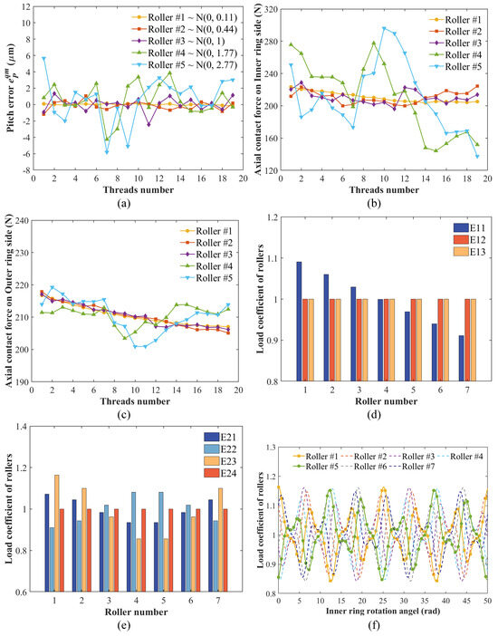 Load distribution of PTRB considering machining errors: (a) thread pitch error of each roller, (b) load distribution on the inner ring-roller side considering roller thread pitch error, (c) load distribution on the outer ring-roller side considering roller thread pitch error, (d) LDC among rollers considering nominal diameter error, (e) LDC among rollers considering axis misalignment error, (f) LDC among rollers considering axis misalignment error when the PTRB is in operation.