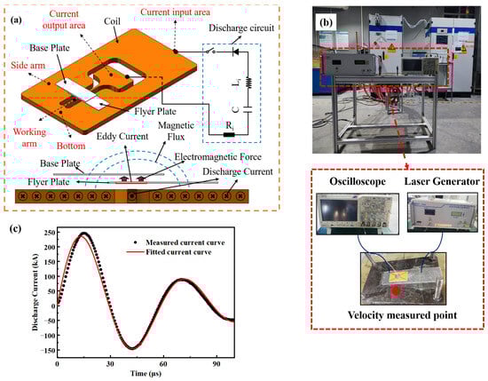 Schematic diagram, experiment equipment, and the discharge current of MPW technology: (a) principle of discharge process; (b) MPW equipment and Photonic Doppler Velocimeter equipment; (c) discharge current and the fitted current curve.