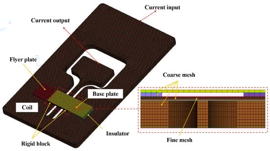 In order to simulate the complex electromagnetic–mechanical–thermal coupled multi-physics process, the LS-DYNA software (LS-DYNA 971) was employed to simulate the MPW process between the AA1060 and T2 copper sheet. The numerical model is illustrated in Figure 2. In the transient electromagnetic field analysis, all elements were assumed to be isotropic and homogeneous. As a result of the high-frequency discharge current and skin effect, the current density and electromagnetic force were concentrated near the surface of the conductive materials. The MPW process simulation model was discretized into 227,230 solid hexahedral elements. To guarantee the precision of the simulation, the deformation zone of the flyer plate was subdivided into more refined hexahedral solid elements (1 × 1 mm2 of 3 layers), whereas the base plate (2 × 2 mm2 of 1 layer) and the external region of the flyer plate (2 × 2 mm2 of 3 layers) were partitioned into coarser hexahedral solid elements, with the objective of reducing the overall number of elements and enhancing the efficiency of the modeling calculations.