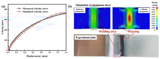 Comparison between experimental and simulated results: (a) velocity–displacement curve; (b) weldment appearance.