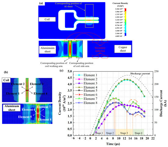 The evolution of induced currents in aluminum sheets can be separated into four distinct stages. In the first stage, the aluminum sheet remained undeformed. During this period, the induced current within the aluminum sheet rose exponentially in conjunction with the discharge current in the coil. In the second stage, the increasing current density in the aluminum sheet decelerated due to the augmented distance from the coil subsequent to the deformation of the aluminum sheet. In the third stage, the current density in the aluminum plate demonstrated a declining trend as the plate underwent further deformation. This is due to the fact that the distance between the aluminum sheet and the coil increased at a rate that outpaced the growth of the discharge current in the coil, thereby counteracting its effect. In the fourth stage, the deformation of the aluminum plate ceased while the discharge current in the coil remained at a high level. Thereafter, the current density in the aluminum plate increased further and eventually decreased gradually as the discharge current decreased.
