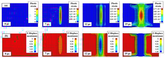Structural field simulation results of the flyer plate during the welding process: (a) effective plastic strain cloud diagram; (b) displacement in Z-direction.