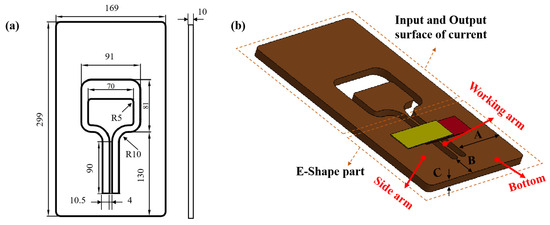 The discharge process in MPW can be represented by a simplified resistor–inductor–capacitor (RLC) oscillating circuit. At the outset, a pre-determined voltage was applied to the capacitor. Upon closure of the discharge switch, a high-frequency current was observed to flow through the coil, resulting in the generation of a transient magnetic field that induced eddy currents in the flyer plate. This phenomenon propelled the flyer plate toward the base plate at a high velocity [27,28]. The single-turn E-shaped copper MPW coil employed in this investigation is illustrated in Figure 1a, comprising five discernible regions: the current input area; current output area; working arm; side arm; and bottom. The current entered the coil from the upper portion, traversed the lateral and inferior arms, and exited from the central region. The narrower width of the working arm resulted in a significant increase in current density, which is conducive to welding metal sheets [29,30].