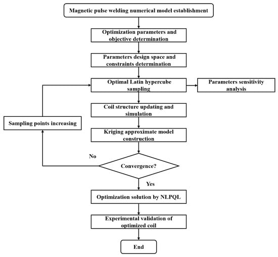 Figure 7 illustrates the optimization flow chart of the MPW coil based on the specified design parameters, scope, space, and optimization objectives. The optimization process commenced with the utilization of the Optimal Latin Hypercube sampling technique (OLHS) [34,35] to sample structural parameters. Subsequently, the MPW simulation model was computed using LS-DYNA commercial software (LS-DYNA 971), with the objective and constraint function values simulated. Then, a sensitivity analysis was conducted to generate Pareto effect diagrams [36,37]. A Kriging model [38,39] was constructed to create a surrogate model for the current density response. The Non-Linear Programming by Quadratic Lagrangian (NLPQL) algorithm [40,41] was employed to obtain the optimization solution for the coil. Finally, an experimental validation was conducted on the optimized coil.
