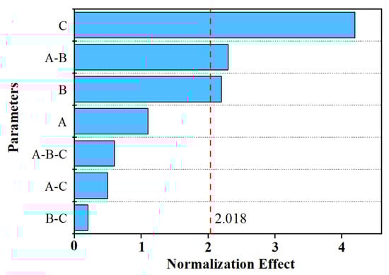 Sixty sampling points were obtained using the optimal Latin hypercube sampling method. The numerical simulation results for all sampling points were used to evaluate the parameter sensitivity and construct an approximate model of the response. Sensitivity analysis results between optimization parameters (including their interaction terms) and the response are shown in Figure 8. The figure shows that coil thickness C has a significant main effect on the optimization response. Additionally, the interaction terms of side arm width A and bottom width B had a significant interaction effect on the optimization response. Figure 9 shows the Kriging fitting surface of different parameters along the induced current density response. The root mean square errors of the Kriging models are all less than 0.05 and meet the accuracy requirements of the optimization. From the approximate model it can be seen that coil thickness has the greatest effect on the induced current density of the aluminum sheet. Side arm width and base width have less effect on the single variable of response and mainly show interaction effects. This is in agreement with the results of the sensitivity analysis.