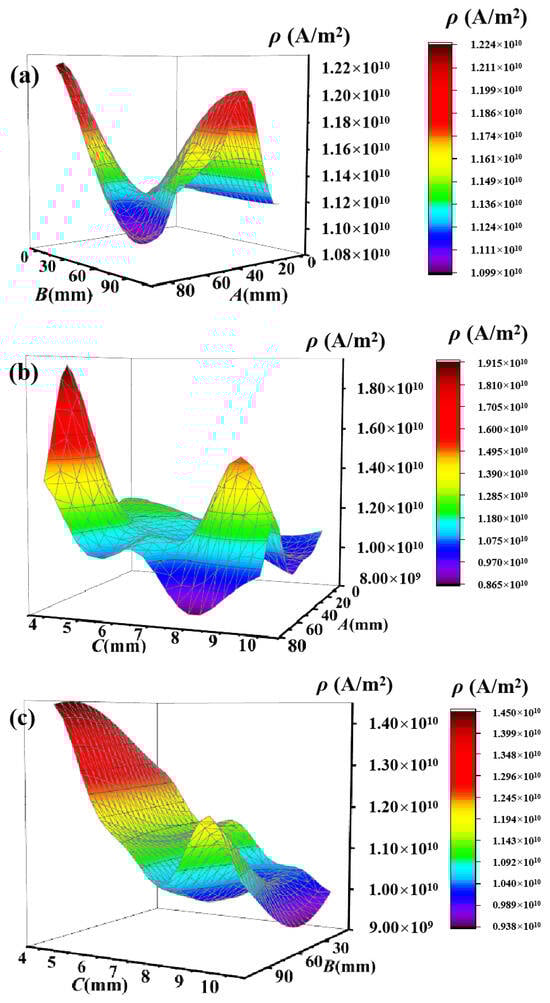 Kriging fitting surface of different parameters along inducted current density response: (a) the side arm width A and the bottom width B; (b) the side arm width A and the thickness C; (c) the bottom width B and the thickness C.